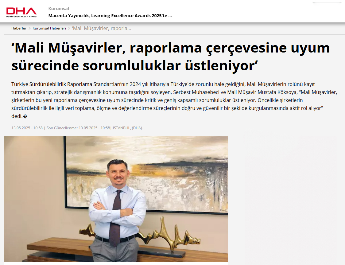 Türkiye Sürdürülebilirlik Raporlama Standartları’nın 2024 yılı itibarıyla Türkiye'de zorunlu hale geldiğini, Mali Müşavirlerin rolünü kayıt tutmaktan çıkarıp, stratejik danışmanlık konumuna taşıdığını söyleyen, Serbest Muhasebeci ve Mali Müşavir Mustafa Köksoya, “Mali Müşavirler, şirketlerin bu yeni raporlama çerçevesine uyum sürecinde kritik ve geniş kapsamlı sorumluluklar üstleniyor. Öncelikle şirketlerin sürdürülebilirlik ile ilgili veri toplama, ölçme ve değerlendirme süreçlerinin doğru ve güvenilir bir şekilde kurgulanmasında aktif rol alıyor” dedi.