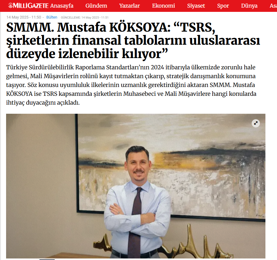 SMMM. Mustafa KÖKSOYA, “TSRS’nin yürürlüğe girmesiyle birlikte işletmeler için sürdürülebilirlik artık sadece bir tercih değil, stratejik bir gereklilik olarak öne çıkıyor. TSRS, şirketlerin çevresel, sosyal ve yönetişim (ÇSY) performanslarını finansal sonuçlarıyla birlikte şeffaf bir şekilde raporlamasını zorunlu kılarak, paydaş beklentilerini karşılama ve uzun vadeli değer yaratma hedeflerine ulaşmada kritik bir rol oynuyor. Bu standartlara uyum sağlamak, yatırımcı güvenini artırmayı, riskleri etkin bir şekilde yönetmeyi ve rekabet avantajı elde etmeyi sağlıyor. Küresel sürdürülebilirlik hedeflerine katkıda bulunarak kurumsal itibarın güçlenmesine de olanak tanıyor” dedi.